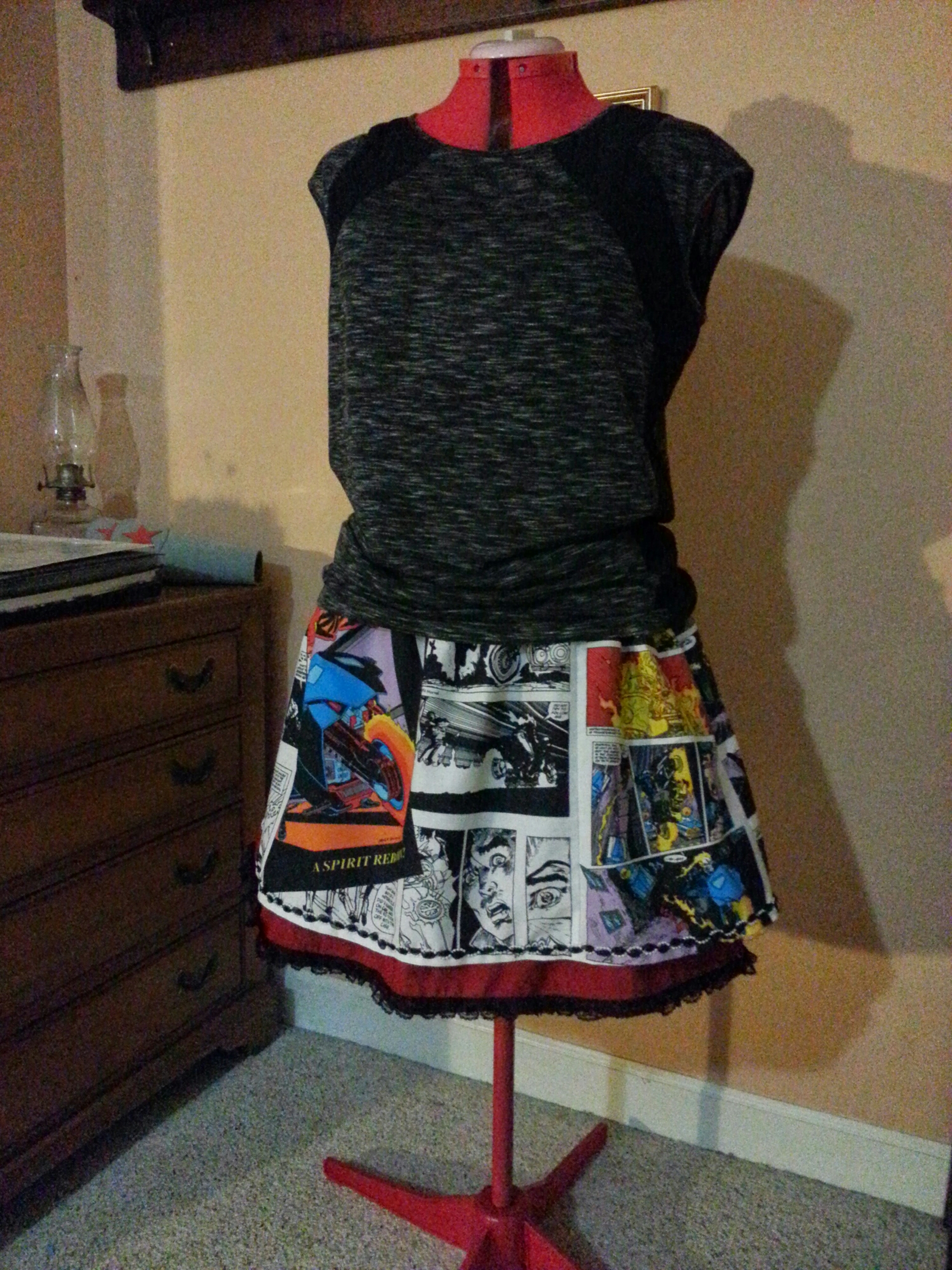 So…my amazing uncle came across some fabric that seems to have been intended for Ghost Rider pillowcases while at an auction. Being the considerate enabler that he is, he thought of me and sent it down. I fully intend to make a portfolio bag and a couple of purses from the remainder of the material, but I had to go ahead and make myself a skirt for this weekend’s convention.